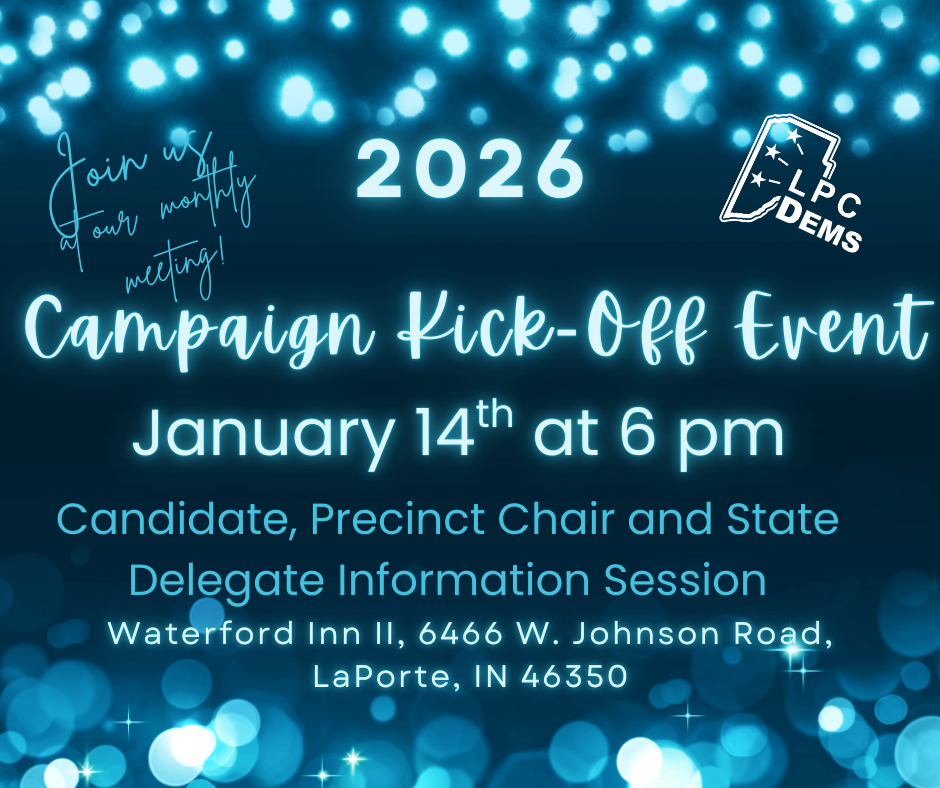 The LaPorte County Democrats believe in a brighter future—one where opportunity knows no bounds, the middle class thrives, and unity triumphs over division. We stand for the fundamental truth that all people are created equal. We honor the dignity of work, the power of unions to uplift families, and the richness that diversity brings to our communities. We value people and planet over profit, and we affirm that women’s rights are human rights—non negotiable and essential to justice. In times of doubt, we choose truth over falsehood, hope over fear, and progress over stagnation. Together, we are building a county where everyone has a fair shot and every voice is heard.